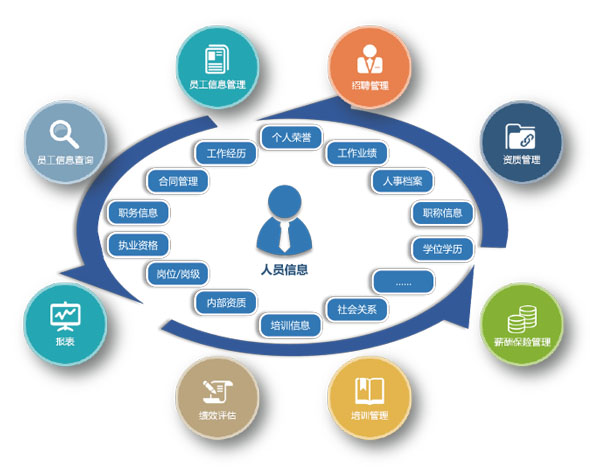 該模塊幫助人力資源專員在系統(tǒng)中定義員工的相關(guān)數(shù)據(jù),主要包括員工基本信息、工作 經(jīng)歷、個(gè)人榮譽(yù)、工作業(yè)績(jī)、合同信息、人事檔案信息、學(xué)歷學(xué)位、職務(wù)信息、執(zhí)業(yè)資 格、崗位/崗級(jí)、內(nèi)部資質(zhì)、社會(huì)關(guān)系以及培訓(xùn)信息等;同時(shí),系統(tǒng)可以完整地查詢一個(gè) 人的所有相關(guān)信息,也支持分類別查詢企業(yè)所有員工的相關(guān)信息。