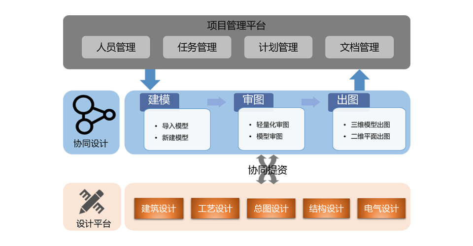 三維協(xié)同設計系統(tǒng)平臺是一個內嵌基于Revit三維設計軟件的工具和microstation設計建模工具插件,在建模過程中幫助設計人員有效開展設計協(xié)作和技術管理,提供集約化的項目管控中心,并實現快速參考、快速分享、快速出圖的提效目標,生成并收集三維模型中圖紙視圖的PDF文件,實現設計院三維翻模的二維出圖過程,幫助實現建設設計企業(yè)搭建三維數字化交付平臺的戰(zhàn)略目標。