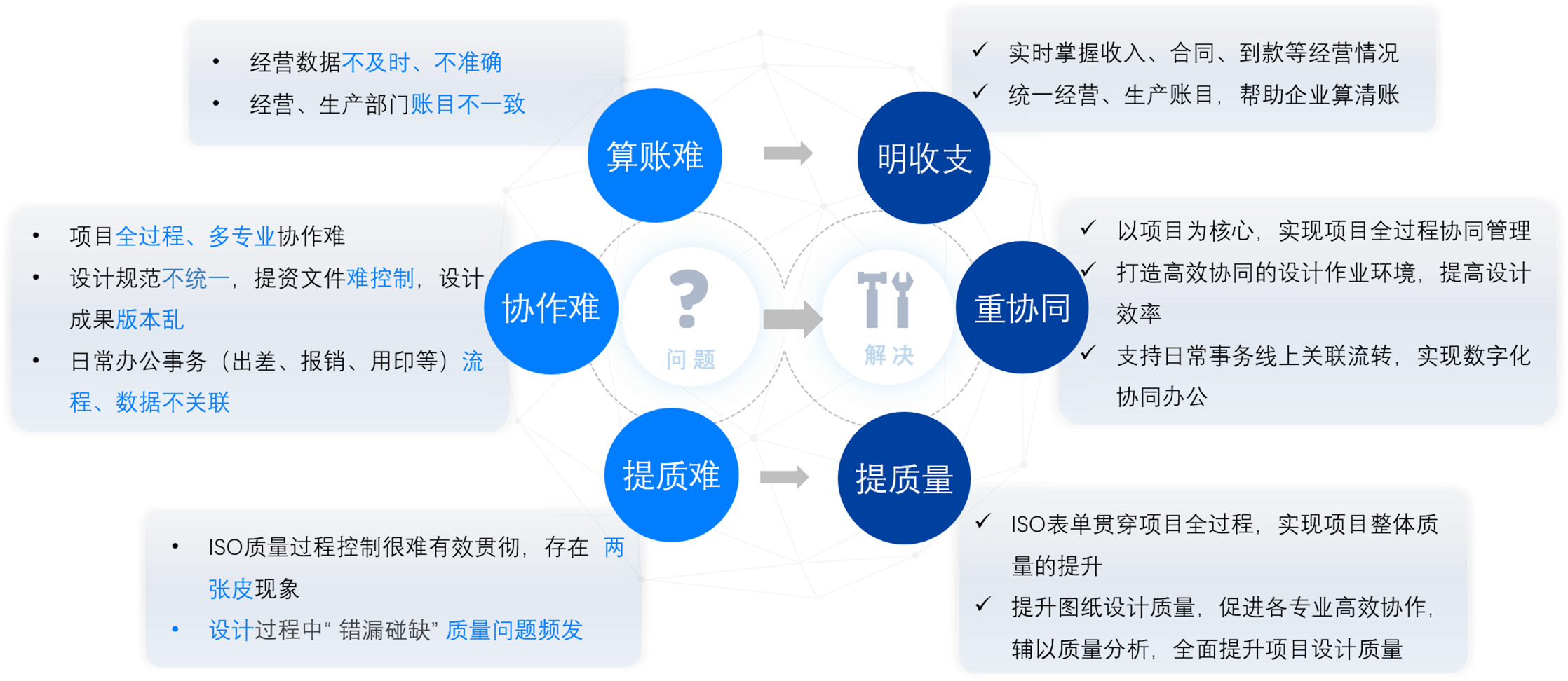 ? 以項(xiàng)目為核心,通過校審、批注等方式促進(jìn)圖紙?jiān)O(shè)計(jì)質(zhì)量的提升;通過設(shè)計(jì)區(qū)、提資區(qū)、任務(wù)區(qū)等方式促進(jìn)專業(yè)間的高效協(xié)作,避免錯(cuò)漏碰缺等質(zhì)量問題;同時(shí)通過各類質(zhì)量分析,讓項(xiàng)目經(jīng)理能實(shí)時(shí)關(guān)注項(xiàng)目質(zhì)量情況。