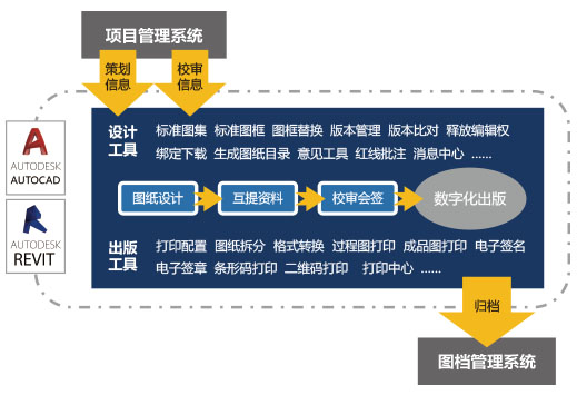 設(shè)計人員完成設(shè)計后,可以在AutoCAD中直接啟動提資流程和設(shè)校審審批流程,并可以與項目管理的相關(guān)里程碑節(jié)點進行管理,真正采集第一手的進度數(shù)據(jù)。