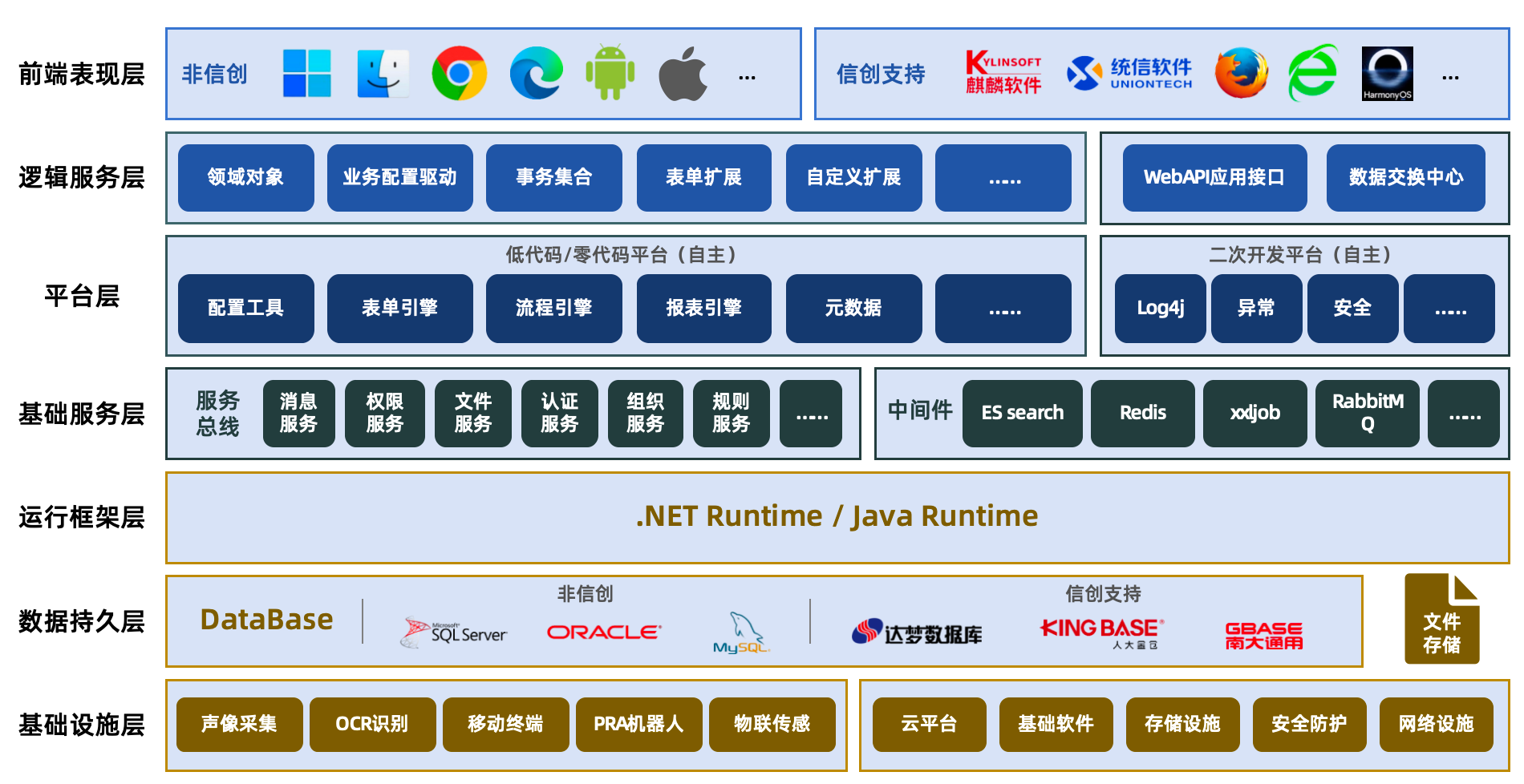 金慧BuildingEasy? 業(yè)務(wù)中臺(tái)是基于.NET和Java技術(shù)構(gòu)建的底層基礎(chǔ)平臺(tái),在設(shè)計(jì)理念上采用組件插拔技術(shù),從數(shù)據(jù)模型和依賴關(guān)系的角度確保各標(biāo)準(zhǔn)應(yīng)用組件的低耦合和業(yè)務(wù)獨(dú)立性,使平臺(tái)可以進(jìn)行廣范圍的應(yīng)用,同時(shí)也使應(yīng)用本身達(dá)到可追溯、可升級(jí)、可利用的要求。 該產(chǎn)品在基礎(chǔ)服務(wù)上對以往產(chǎn)品進(jìn)行了深度提煉,以“配置管理”為應(yīng)用層次設(shè)計(jì)的架構(gòu)思路從一開始就進(jìn)行了管理模式的多維抽象,在大量業(yè)務(wù)數(shù)據(jù)的積累下構(gòu)建了多套管理模型,為各應(yīng)用系統(tǒng)的快速搭建提供了穩(wěn)定的數(shù)據(jù)基礎(chǔ)和可靠的多元拓展。 該產(chǎn)品的整體技術(shù)框架設(shè)計(jì)為七層技術(shù)架構(gòu)體系,分為基礎(chǔ)設(shè)施層、數(shù)據(jù)持久層、運(yùn)行框架層、基礎(chǔ)服務(wù)層、平臺(tái)層、邏輯服務(wù)層、前端表現(xiàn)層。這些邏輯架構(gòu)通過不同的接口和服務(wù)相互通訊,為企業(yè)的業(yè)務(wù)開展和管理實(shí)現(xiàn)提供服務(wù)。