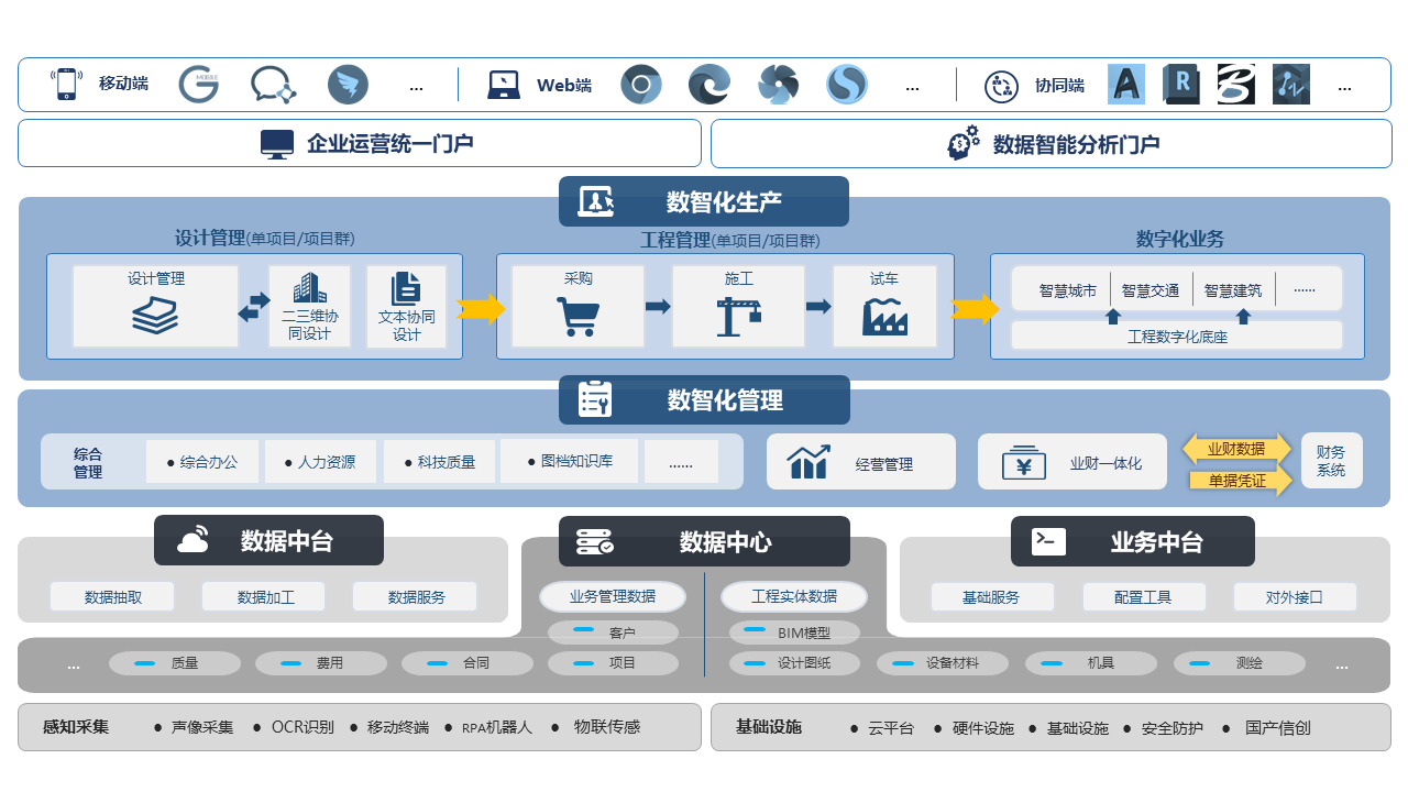集生產(chǎn)、經(jīng)營(yíng)、管理、智能化為一體,構(gòu)建數(shù)智化管理、數(shù)智化生產(chǎn)兩大應(yīng)用領(lǐng)域,主要包含綜合管理、經(jīng)營(yíng)管理、業(yè)財(cái)一體化、設(shè)計(jì)管理、工程管理、數(shù)字化業(yè)務(wù)和運(yùn)營(yíng)門戶及智能分析門戶等多個(gè)子系統(tǒng)。分別從經(jīng)營(yíng)人員、設(shè)計(jì)人員、工程管理人員等人員角度出發(fā),有效整合業(yè)務(wù)流程, 提高協(xié)作效率和工程質(zhì)量,有效降低成本。同時(shí)該產(chǎn)品利用AI智能分析和可視化手段,為管理者提供戰(zhàn)略決策支持,進(jìn)而實(shí)現(xiàn)企業(yè)內(nèi)部精細(xì)化管理的目標(biāo),以數(shù)據(jù)驅(qū)動(dòng)業(yè)務(wù),提高決策水平,推動(dòng)企業(yè)數(shù)智化轉(zhuǎn)型。