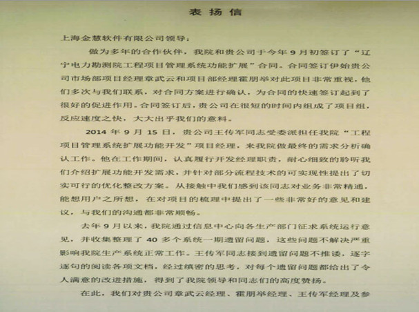 上海金慧軟件項(xiàng)目組人員在項(xiàng)目推進(jìn)過(guò)程中,積極與遼寧電力院各個(gè)應(yīng)用層面的人員進(jìn)行溝通交流,認(rèn)證履行項(xiàng)目人員職責(zé),耐心細(xì)致的聆聽(tīng)客戶擴(kuò)展功能的開(kāi)發(fā)需求,并針對(duì)部分流程技術(shù)的可實(shí)現(xiàn)性提出了切實(shí)可行的優(yōu)化整改方案,對(duì)每個(gè)遺留問(wèn)題都給出了令人滿意的改進(jìn)措施,與客戶溝通順暢得到,得到了客戶院領(lǐng)導(dǎo)的高度表?yè)P(yáng)。