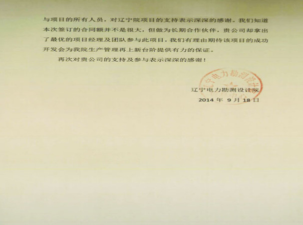 2014年9月18日,我公司收到來(lái)自遼寧電力勘測(cè)設(shè)計(jì)院的一封表?yè)P(yáng)信。