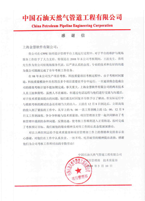 2009年3月10日我公司收到中國(guó)石油天然氣管道工程有限公司一封感謝信。