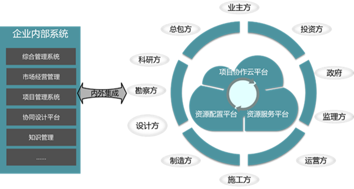 在產(chǎn)業(yè)“互聯(lián)網(wǎng)+”的時代下,通過打造云平臺(私有云或公有云),產(chǎn)業(yè)鏈的各方將從以往的串行的“價值鏈”合作模式向閉環(huán)的“價值環(huán)”模式升級,以實現(xiàn)更強的資源整合能力及更高效的多方協(xié)作能力:通過“資源服務(wù)平臺”獲得更高性價比的軟硬件資源;通過“資源配置平臺”發(fā)包方獲得更優(yōu)的資源,承包方獲得更多的商機;通過“項目協(xié)作云平臺”保障各方的高效協(xié)作及項目的管控;同時互聯(lián)網(wǎng)平臺與內(nèi)部系統(tǒng)進行內(nèi)外集成,以保障內(nèi)外部數(shù)據(jù)及應(yīng)用的一致性,并滿足內(nèi)外部應(yīng)用的差異性。