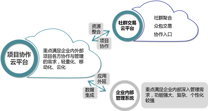 另外通過對社群交易平臺、項目協(xié)作平臺以及內(nèi)部管理系統(tǒng)的集成,實現(xiàn)資源交易、內(nèi)外部協(xié)作、內(nèi)部管理的數(shù)據(jù)交互,以保障內(nèi)外部數(shù)據(jù)及應(yīng)用的一致性,并滿足內(nèi)外部應(yīng)用的差異性。