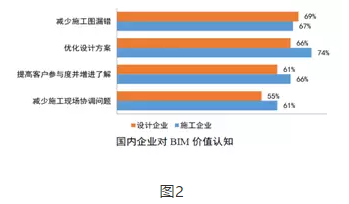 國內(nèi)企業(yè)對BIM設(shè)計價值認知(圖2)所提供的數(shù)據(jù)可以看出,減少施工圖漏錯在69%左右,優(yōu)化設(shè)計方案在66%左右,提高客戶參與度并增進了解在61%左右,減少施工圖現(xiàn)場協(xié)調(diào)問題在55%左右,因此目前BIM還處于三維化應用,還沒有進入到信息化應用。