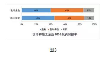 國內(nèi)設(shè)計企業(yè)在應用BIM投資回報率(圖3)中可以看到有40%盈利、45%盈利平衡,只有15%的設(shè)計企業(yè)屬于虧損的。