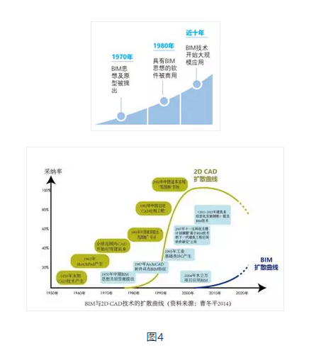 BIM在我們過去十年中的擴散進程,尚未呈現(xiàn)出類似于2D CAD在20世紀90年代的快速發(fā)展局面(圖4)。
