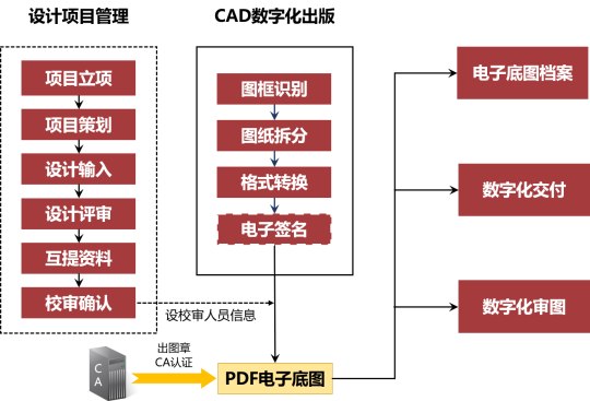 與設(shè)計(jì)項(xiàng)目管理系統(tǒng)結(jié)合,可根據(jù)校審、會(huì)簽的信息,自動(dòng)進(jìn)行相關(guān)人員進(jìn)行電子簽名操作。同時(shí)系統(tǒng)還支持在圖紙簽名后的環(huán)節(jié)擴(kuò)展蓋電子出圖章(通過CA認(rèn)證)的功能。