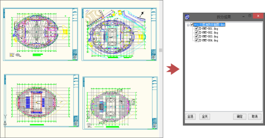 通過識(shí)別標(biāo)準(zhǔn)/非標(biāo)準(zhǔn)圖框,對(duì)該批圖紙文件進(jìn)行按圖框批量拆分,拆分為一個(gè)圖框一個(gè)文件,并自動(dòng)拾取圖框中的圖紙名稱;