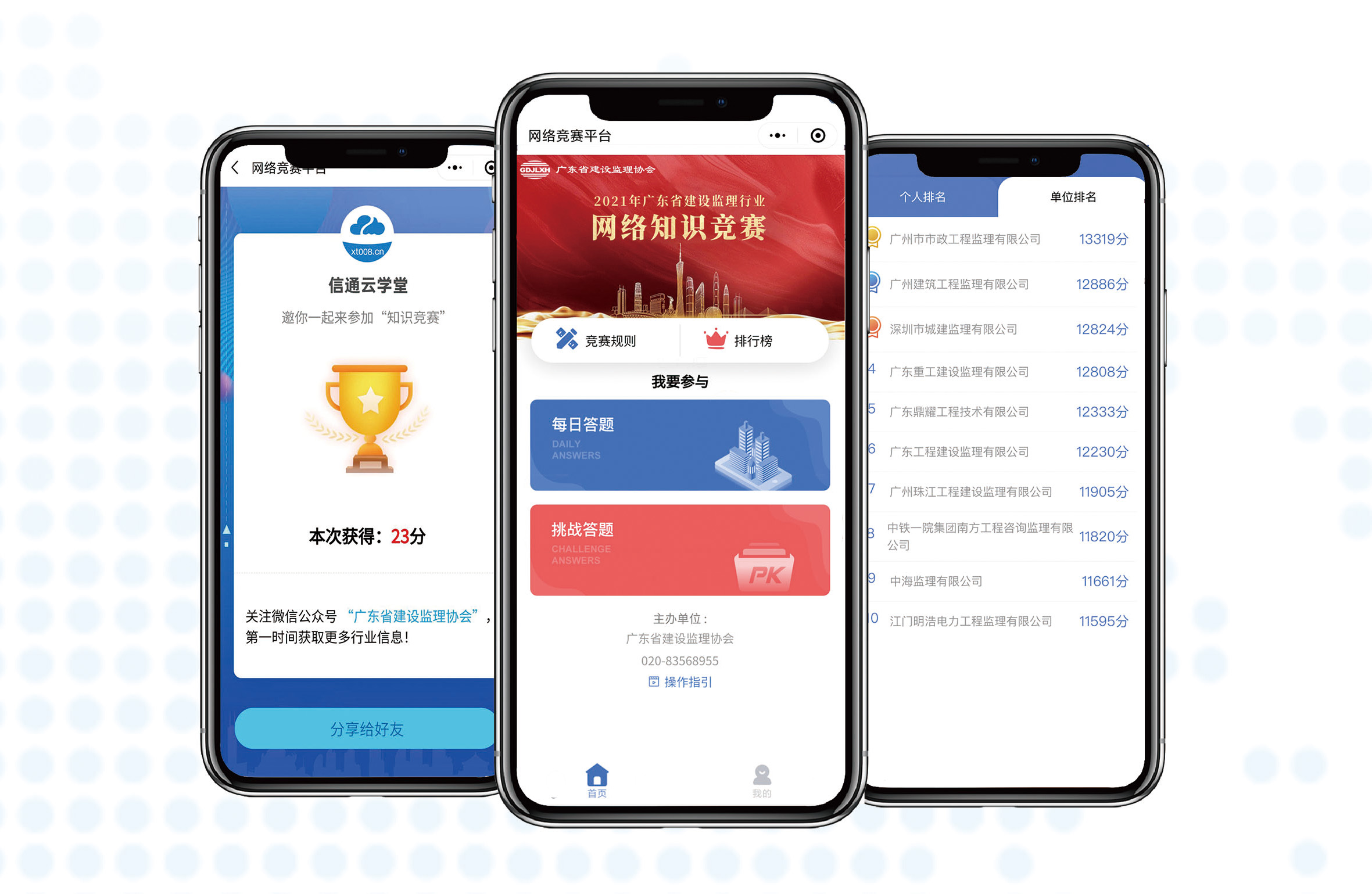 信通云學(xué)堂知識(shí)競(jìng)賽是一款專(zhuān)門(mén)為工程建設(shè)企業(yè)、行業(yè)協(xié)會(huì)打造的趣味答題競(jìng)賽小程序,可用于年會(huì)、周年慶、安全月、知識(shí)競(jìng)賽等培訓(xùn)活動(dòng)。