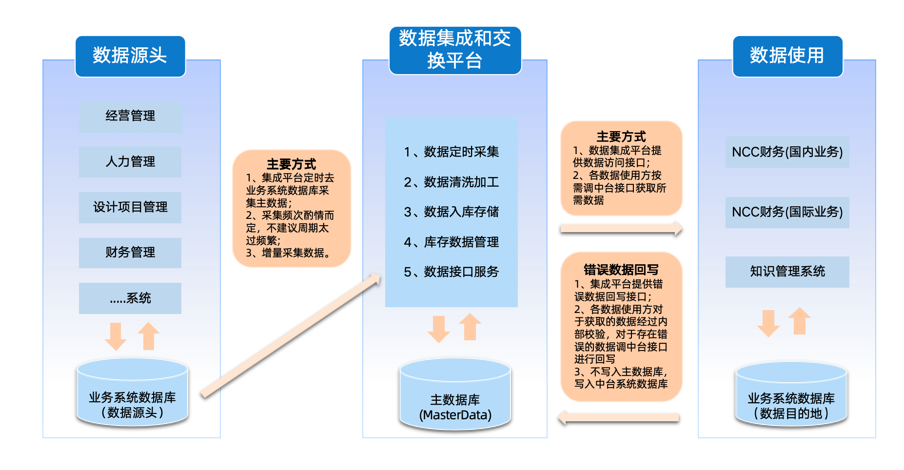 建立主數(shù)據(jù)標(biāo)準(zhǔn):將組織、人員、財(cái)務(wù)、經(jīng)營、項(xiàng)目等定義為企業(yè)核心主數(shù)據(jù),理清數(shù)據(jù)含義、業(yè)務(wù)規(guī)則、質(zhì)量規(guī)則、數(shù)據(jù)來源、存儲路徑、管理部門等,對于原有各系統(tǒng)中的重復(fù)數(shù)據(jù)進(jìn)行梳理、合并、清洗,形成唯一的數(shù)據(jù)標(biāo)準(zhǔn)。