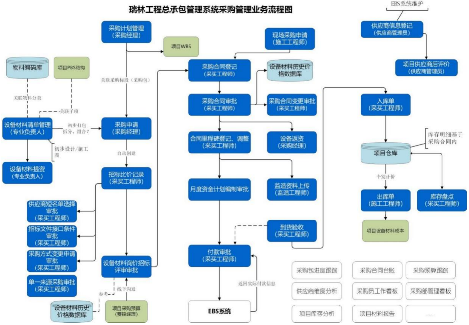 中國瑞林根據(jù)采購管理體系要求,劃分為采購計劃、請購管理、招標管理、合同管理、監(jiān)造到貨管理、款項支付管理、物流出入庫管理幾部分,具體業(yè)務(wù)功能包括采購計劃管理、采購清單管理、采購申請、招標比價管理、合同評審與簽訂、付款項管理、付款計劃、付款申請、發(fā)票管理、到貨驗收管理、出入庫管理、采購計劃跟蹤、合同臺賬查詢等。采購業(yè)務(wù)流程圖如下: