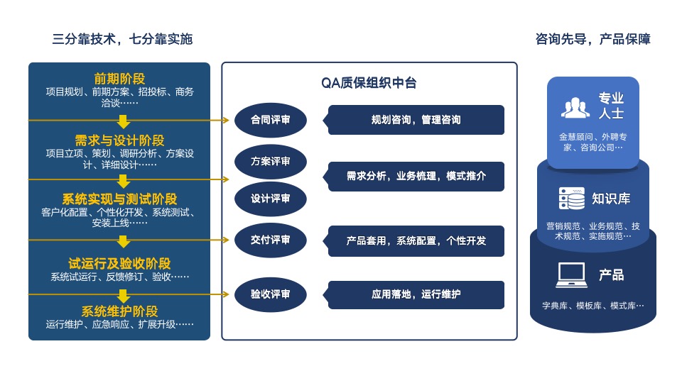數(shù)字化成功與否,三分靠技術(shù),七分靠實(shí)施”,實(shí)施過程直接決定了結(jié)果。金慧軟件具有多年大中小型項(xiàng)目軟件開發(fā)和項(xiàng)目實(shí)施及服務(wù)的經(jīng)驗(yàn),并在項(xiàng)目實(shí)踐過程中形成一套有效控制項(xiàng)目過程和質(zhì)量的實(shí)施方法論,能夠減少項(xiàng)目實(shí)施風(fēng)險(xiǎn),降低對(duì)項(xiàng)目經(jīng)理能力的依賴,提升項(xiàng)目實(shí)施效率和成功率。